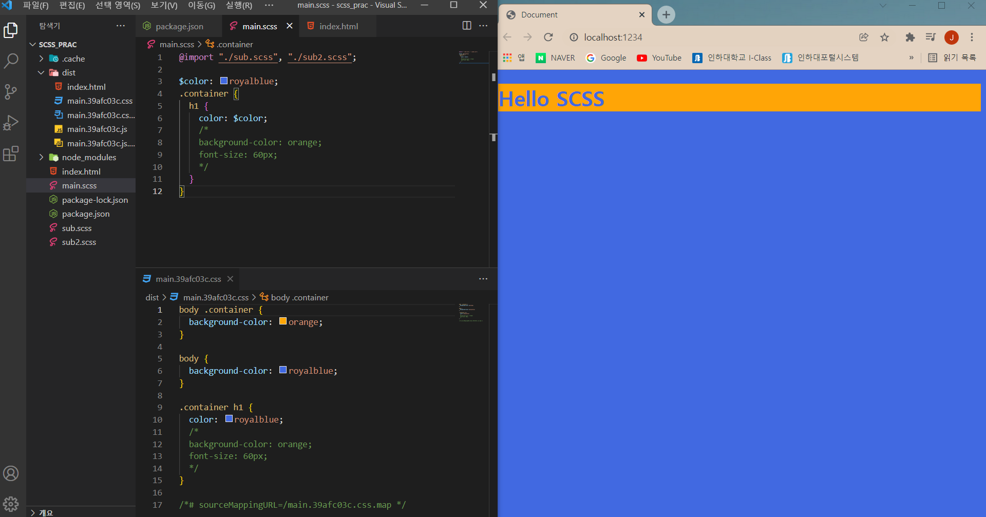 main.scss에 간단하게 SCSS 문법을 작성하고 npm run dev 하시면