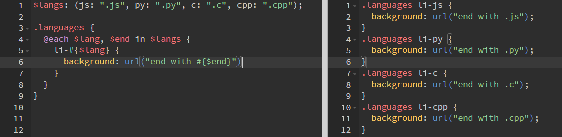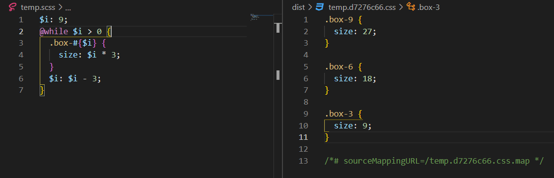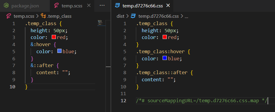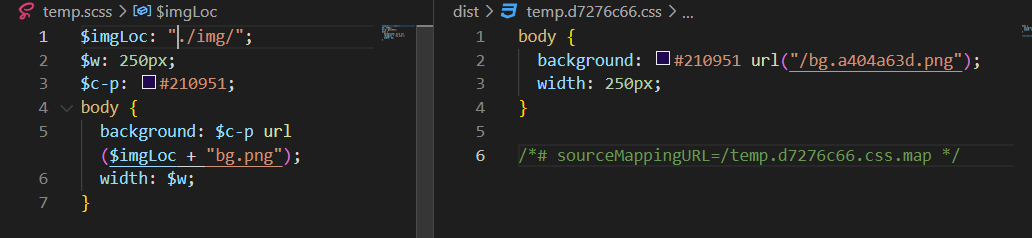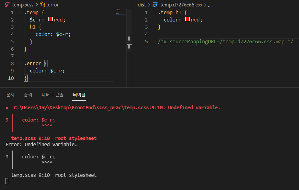 예를 들어 아래의 예시에서 .temp 쪽에서 $c-r을 선언했고 이를 아래의 다른 scope를 가진