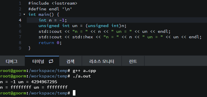 그러나 C나 C++에서는 signed와 unsigned에서 어떤 연산이 발생했을 때 (그게 산술연산이든 비교연산이든)