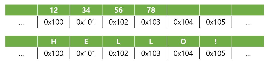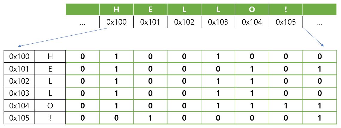메모리 주소에는 0x100, 0x101, 0x102, 0x103, 0x104, 0x105의 메모리 주소에 각각의 단어들이 저장될 것이다.