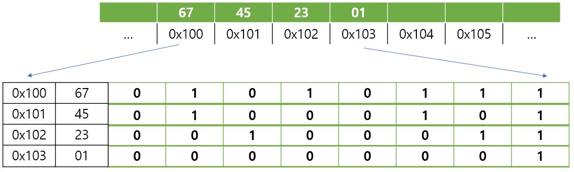 int x 에 0x01234567을 저장하고 메모리 주소가 0x100번지부터 시작한다고 해보자.