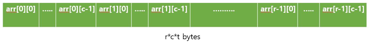 연속적인 배열로 존재하는 것이다. 예를들어 아래와 같이 T arr[r][c]라는 배열을 선언했다면, 아래와 같이 만들어진다.