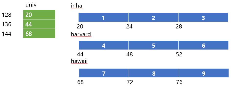 각각의 배열 자체는 연속적이다. 물론 당연하게도 univ라는 포인터 배열의 경우에도 적용이 된다.