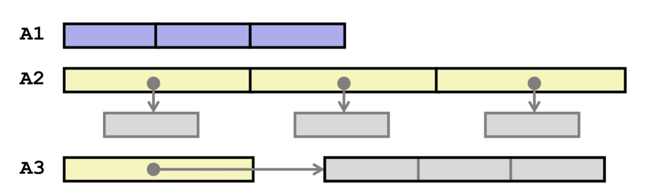 일반적으로 multi-level array라고 하면 포인터 배열에 다른 배열의 주소값이 담겨있는 것을 의미한다.