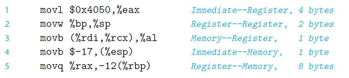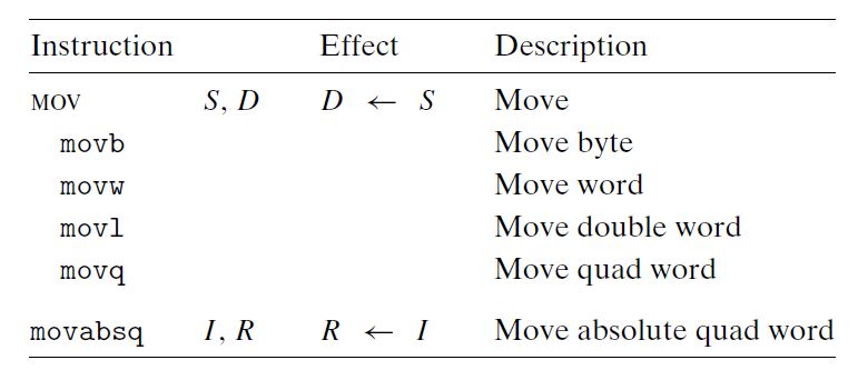 명령어들에 있어서 instruction은 중요하다. 또한 그에 못지 않게 레지스터의 크기 또한 중요하다. 우리는 여러 다른 명령어를 명령어 클래스로 그룹화할 수 있다. 여기서 클래스 명령어는 동일한 연산을 수행하지만 피연산자 크기는 다르다는 것이다. 아래의 그림을 보면 알 수 있겠지만 mov 명령어의 클래스는 4가지로 나눌 수 있는데, 이들은 각각 1, 2, 4, 8바이트와 같은 다양한 크기의 데이터에서 작동한다는 점에서 주로 다르다. 여기서 레지스터의 크기는 명령어의 마지막 문자('b', 'w', ' l' 또는 'q')로 결정이 되며, 대부분의 경우 mov 명령어는 대상 피연산자가 나타내는 특정 레지스터 바이트 또는 메모리 위치만 업데이트를 한다.