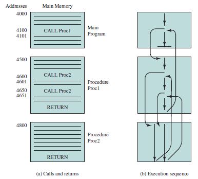 메인 메모리가 4000번지, Proc1이 4500번지, Proc2가 4800번지에서 시작한다고 가정했을 때 Call Proc1이 실행될 때 4101번지가 Stack에 저장된다. 이때 왜 4100이 아니라 4101이냐는 의문이 생길 수 있지만 돌아와서 수행해야하는 주소를 적어놓은 것이다. Proc1을 수행하고 Proc2가 호출이 되면 4601번지를 Stack에 push하고, Proc2의 수행이 끝나면 pop해서 복귀를 하게 된다. 이런식으로 복귀할 주소를 push, pop을 반복하는 작업을 한다.
