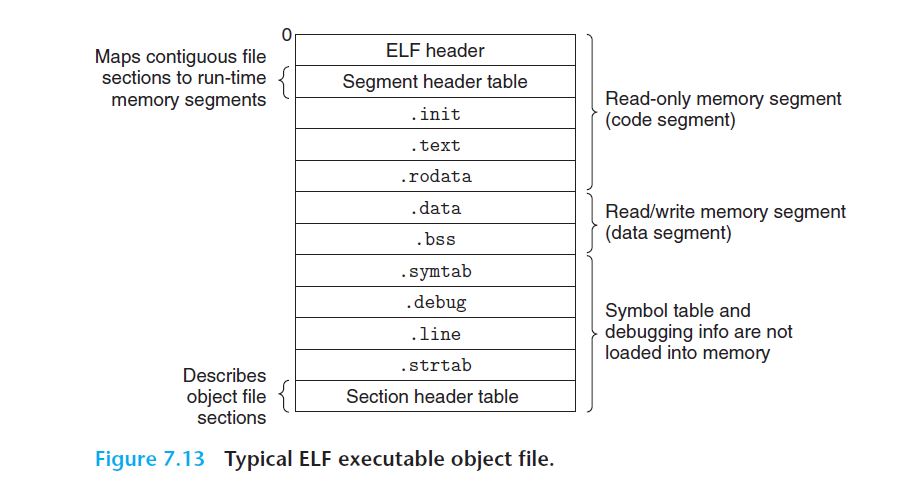 왼쪽 그림은 ELF Executable Object File의 Format이며, 오른쪽이 그 전에 봤던 ELF Relocatable Object File Format이다. ELF헤더 및 다른 Section이 거의 비슷한 것을 볼 수 있다. ELF Header는 word size, byte ordering 등 전반적인 메타데이터에 대한 정보를 담고 있다. Segment Header Table은 Linking 후에 Executable 파일에 생성이 되면 loading을 위한 정보가 저장된다. Relocatable Object File의 .rel text나 .rel data 같은 경우는 Linker가 나중에 처리해야할 작업들 정도로 생각하면 될 것이다.