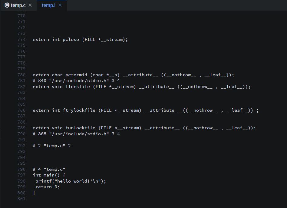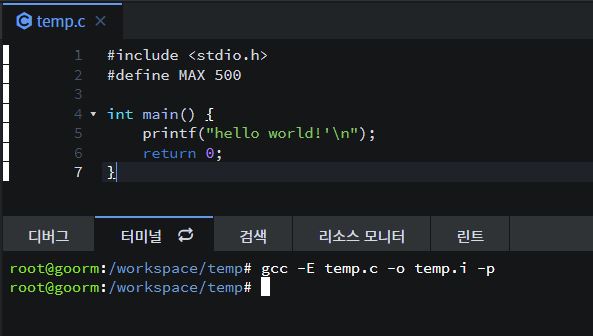 temp.c를 -E 옵션을 주어서 실행을 하게되면 .i 확장자를 가진 파일이 하나 나오게 된다.