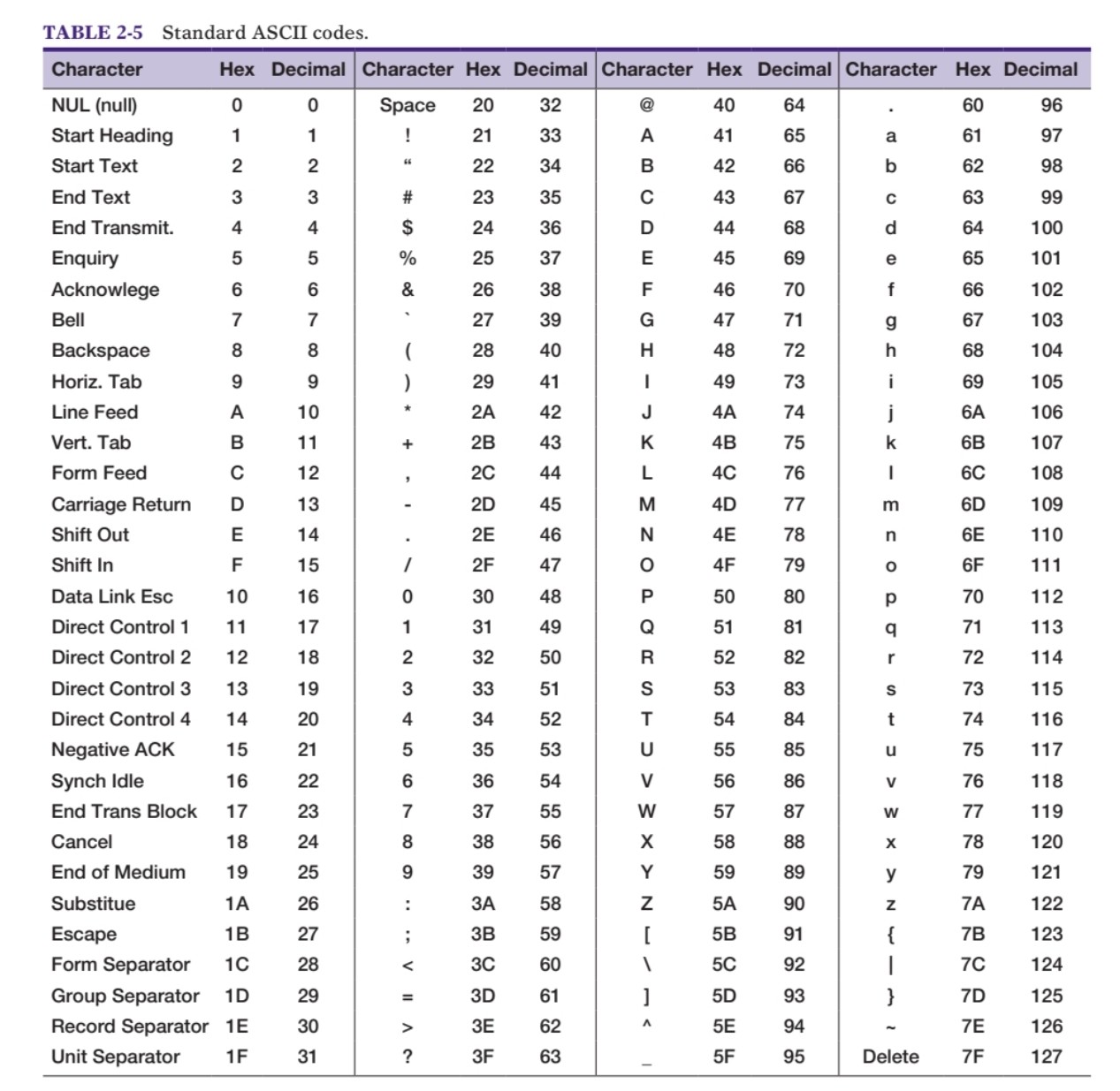 아래는 Standard ASCII code의 Table이다.