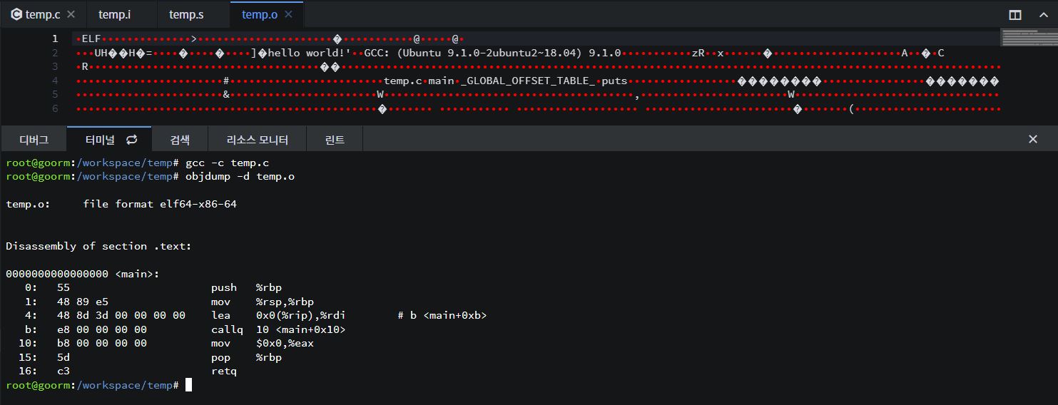 따라서 -c 옵션을 주고 .o 파일을 생성 후 objdump -d temp.o 라는 명령어를 통해 그 내용을 볼 수 있다.