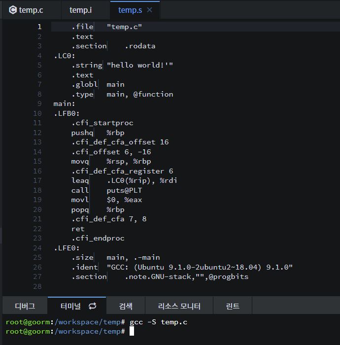 컴파일러는 위에서 생성된 temp.i 이라는 text file을 해석해서 temp.s라는 text file로 변환시킨다.
