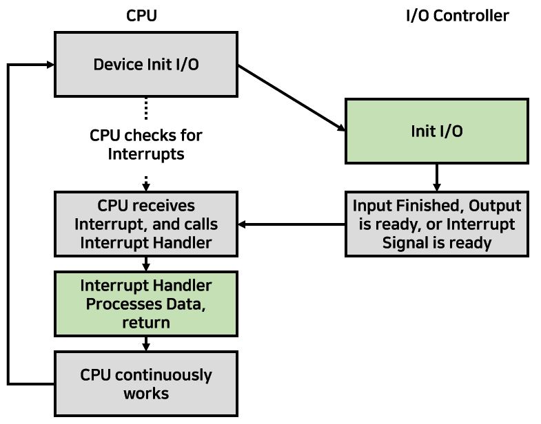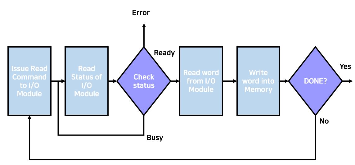 - Status-Checking Loop(While)에 들어가서 Ready 상태이면 I/O를 처리하고, Busy 상태라면 일정 시간 기다린 후 다시 Status를 Check하게 된다. 이때 Check를 하는 주체는 CPU가 되겠다.