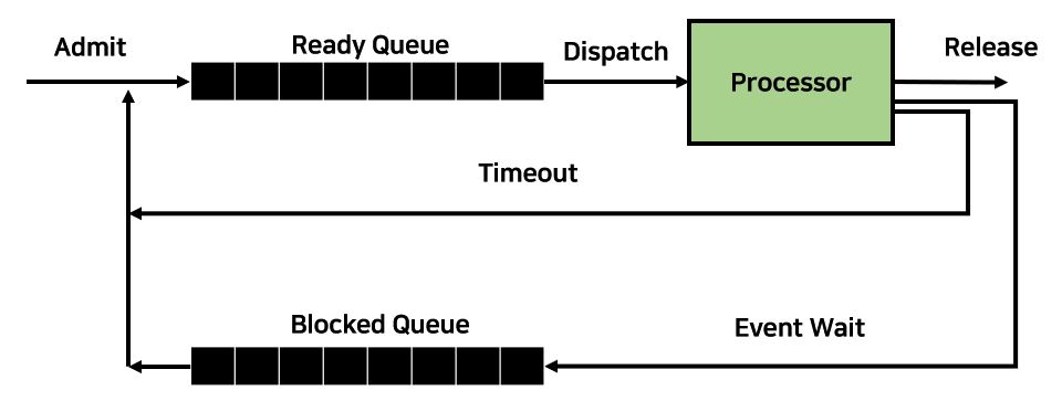 가장 단순한 Processing Model이다. 이는 정말 단순히 Process가 Execute되고 있는지, 아닌지만 판별한다. Processor에 Dispatch되면 Running State로, Pause되면 Not-Running State로 변화하게 된다. 물론 지금 가정하고 있는 것은 Processor가 하나일때를 가정하고 것이다. 아래의 그림은 단순하게 State로 나타낸 것이고 그 다음 그림은 실제 Queue로 구현되어 Process들이 기다리게 되는 상태를 그린 그림이다. Process는 Enter하게 되어 먼저 대기 Queue에 들어가게 된다. 이때 Process의 State는 Not Running이다. Scheduling Algorithm에 의해 Process가 Dispatch되면 Running State로 바뀌게 되고, Processor는 해당 Process를 처리하게 된다. 만약 이 Process가 Timeout, I/O Request 등으로 인해 Interrupt가 발생하게 된다면 다시 Queue로 돌아가게 되며, 처리가 다 끝난 경우에만 Exit한다.