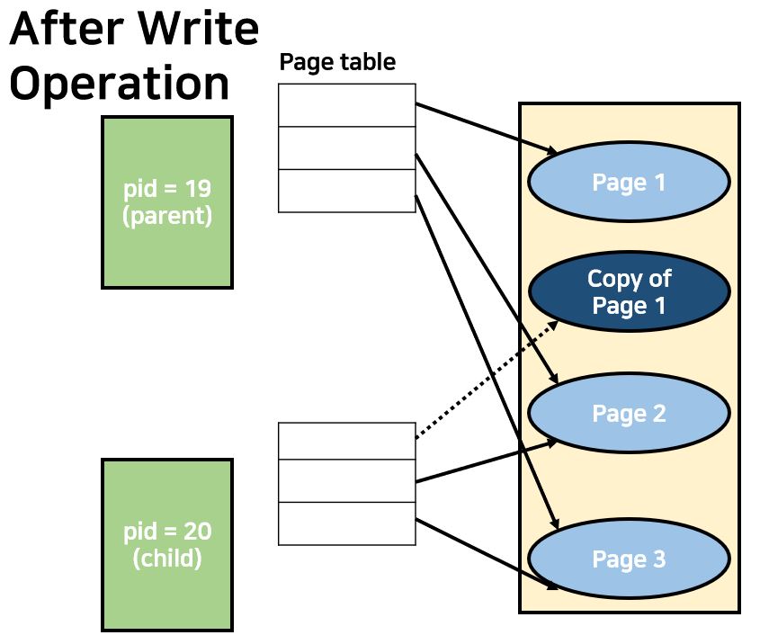 그러나 Fork는 Exact Copy본을 생성하는 것이기 때문에 생각보다 자원의 소모량이 많았다. 해당 사이즈의 크기 만큼 모조리 다 복사해야하는 것이기에 시간적으로 낭비가 있었다. 이를 해결하기 위해 vfork라는 기능이 있었지만, 현대 LINUX에서는 COW 방식을 채택하고 있다. COW 방식은 Optimization 방식 중 하나로 Process의 생성속도를 높인다. 먼저 Parent Page는 Shared된 상태로 마크가 되어 있다. 즉, Child Process는 단순히 Parent Page와 메모리를 공유하고 있는 상태인 것이다. 이때 Shared된 Page에 변화가 생기면 그제서야 OS는 이 페이지에 대한 Copy본을 만들게 된다. 이로서 각각의 Process는 다른 영역의 Resource를 사용할 수 있게 된다. 싱글 쓰레딩을 사용하는 경우에 COW를 Mutex를 활용하여 임계영역을 오가면서 구현이 되었지만, 멀티 쓰레딩을 지원하면서부터 Copy와 Write가 동시에 처리될 수 있게 되었다.