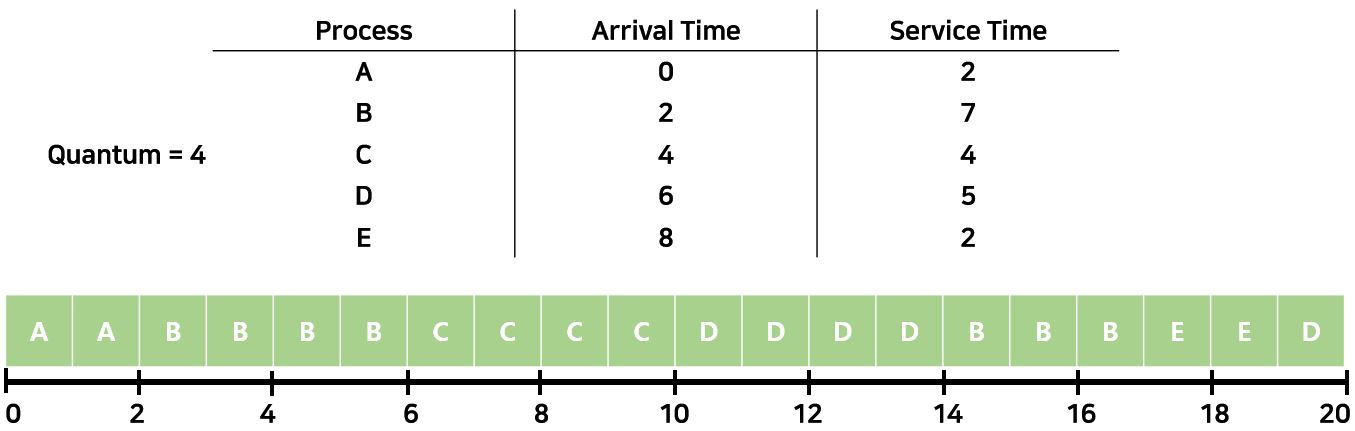 위의 그림을 보자. Time Quantum이 4일때를 가정한 그림이다. 0시점에서 2시점까지 A는 잘 실행된다. 이제 2에서 6시점을 보면 Process B는 Time Slice를 4를 소진했기 때문에 Time Out되고 Queue에 들어간다. 4시점에는 C가 들어와있고, 6시점에는 CDB가 들어가게 된다. 여기서 CDB 순서가 될 수도 있고, CBD 순서가 될 수도 있는데 이는 OS가 어떤 것을 먼저 Queue에 먼저 넣는지에 따라 다르다. 여기에서는 편의상 Time Out된 Process가 제일 뒤로 간다고 가정하겠다. C는 정상적으로 4의 Time Slice를 전부 소진했고, D는 4를 소진했으니 D의 한개의 Slice는 다시 Queue에 넣어지게 된다. 그 후 남아있는 B와 E를 Queue에 들어온 순서대로 수행한 후에 D까지 수행하면 끝마치게 된다. Turnaround Time은 A: 2, B: 15, C: 6, D: 14, E: 11 이고 Average Turnaround Time은 9.6이 된다.