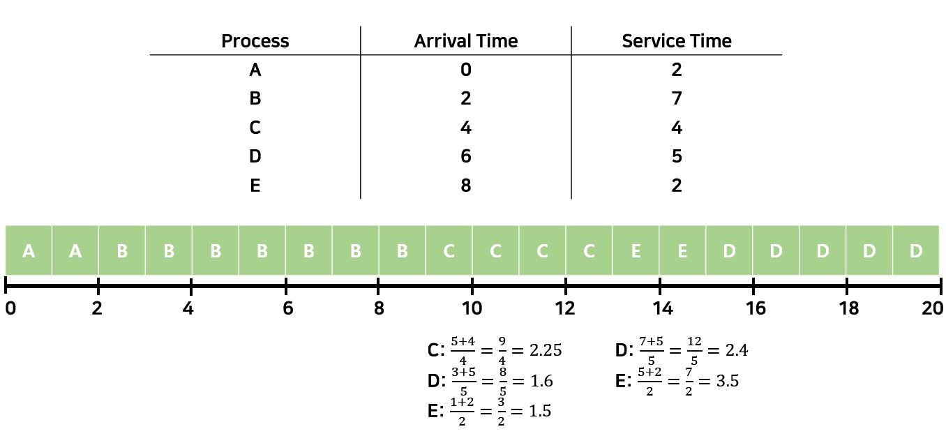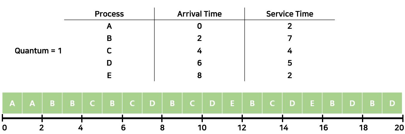 Decision Mode는 Non-Preemption이다. HRRN이 나온 이유는 SPN이나 SRT에서 Long Process들에게 Starvation이 발생한다는 것이었다. 이제는 위의 Ratio를 통해서 Process를 선택하기 때문에 s가 작을수록 값이 커지고, q가 길어질수록 값이 커진다. 이래서 Long Process도 뒤로 밀리지 않고 선택을 받아 수행될 수 있는 것이다. HRRN을 Starvation을 회피하기 위한 Corner Case라고 말하기도 한다.