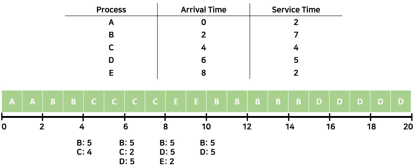 다음으로 살펴볼 알고리즘은 SRT이다. 이 알고리즘은 SPN의 개선된 버전이라고 보면 될 것이다. SPN과 다르게 Preemption 전략을 취하고 있다. 또한 Selection Function도 min[S]가 아닌 min[S - E]가 된다. 따라서 이 알고리즘은 Process가 들어올 때 S - E를 비교하게 된다. 이 비교를 하고나서 min값을 선택에 Preemption된다. 이는 가장 Optimal하다고 할 수 있는 알고리즘이다. Turnaround Time관점에서 SPN보다 뛰어난 성능을 보인다. 하지만 문제는 Overhead가 매우 크다는 단점이 있다. 모든 Process에 대해서 최솟값을 계산해야 하고, 최솟값을 유지해야하기 때문에 최소 O(n)이 걸릴것이다. 또한 이 역시 S - E값이 크다면 Long Process에 대한 Starvation이 발생할 수도 있다.