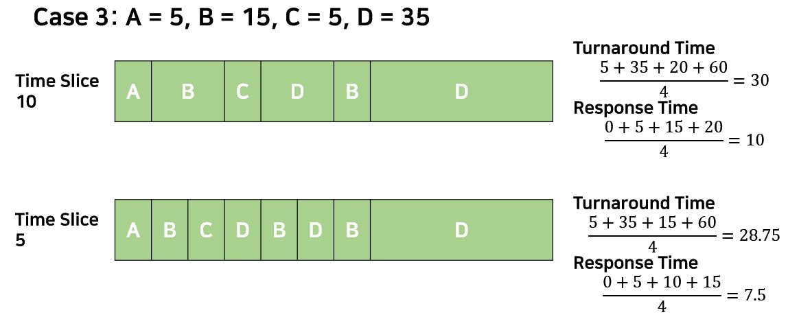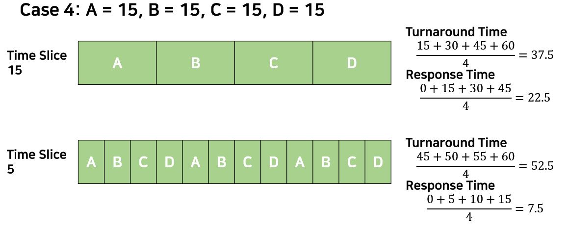 세 번째 Case의 두 알고리즘 모두 RR이며 각각 Quantum을 10, 5로 설정해놓은 것이다. Quantum과 Slice는 같은 의미이다. 위 예시를 통해 Time Slice가 작아질수록 Response Time도 작아지는 것을 볼 수 있다. 따라서 Quantum과 Response Time은 정비례 관계이다. FIFO나 SPN은 Preemption이 아니기 때문에 Response Time은 RR보다 현저히 떨어진다.