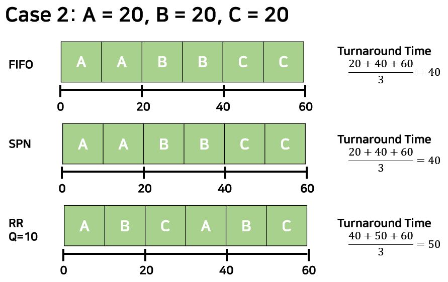 두 번째 Case에서는 FIFO와 SPN이 동일한 Turnaround Time을 가지고 있는것을 볼 수 있다. 그래서 SPN도 여기서 효율적이라고 생각을 할 수 있지만, 고민을 해봐야 하는 것은 SPN은 min값을 찾는 것이다. 따라서 Process가 끝날때마다 min을 계산 하기 때문에 O(n)을 Process의 개수만큼 반복해야 하기 때문에 총 시간 복잡도는 O(n^2)이 될 것이다. 반면 FIFO는 단순히 front와 pop Operation만 수행하면 된다. 따라서 전체적인 시간 복잡도는 O(1)이 걸릴 것이다. 이렇게 Time이 전부 다 같다면 FIFO를 선택해서 사용하는 것도 고려할만 하다는 것이다.