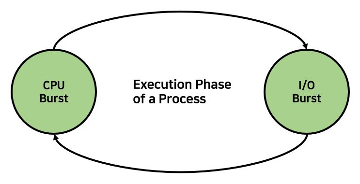 Burst라는 용어가 있다. 직역을 하면 파열 정도로 해석이 되는데 OS에서의 의미는 시간이라는 뜻이다. 즉 Operation을 수행하는 시간이라는 것을 발한다. OS에서 다루는 Burst는 두 가지의 종류가 있다. 하나는 CPU Burst이다. 이는 CPU가 실제 Operation을 수행하는 시간을 의미한다. 다른 하나는 I/O Burst인데 이는 CPU가 I/O를 위해 대기하는 시간을 의미한다. Process는 CPU Burst와 I/O Burst를 필연적으로 반복하면서 수행한다. 이러한 구조를 CPU - I/O Burst Cycle이라고 한다. 예를 들어 명령어를 수행하는 것은 CPU Burst인데 read, write 등의 Operation이 발생하면 필연적으로 I/O Wait이 발생하기 때문에 이를 Execution Phase of Process라고도 한다.