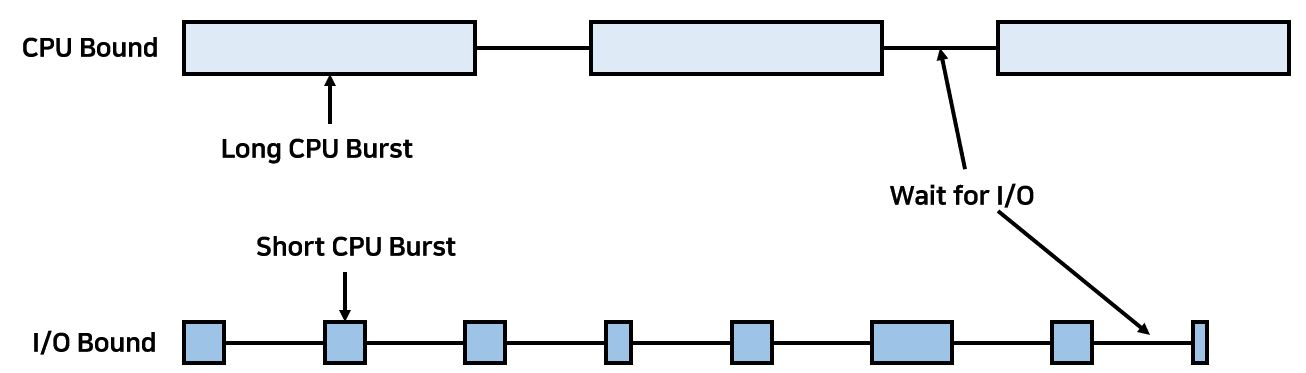 다음으로 살펴볼 용어는 Process의 Type 혹은 Program의 Behavior라고 하는 것이다. 이 역시 두 가지로 나뉘는데, 첫 번째로는 I/O Bound가 있다. 이는 CPU Burst가 짧고 I/O Burst가 긴 것을 의미한다. 반대로 CPU Bound는 CPU Burst가 길고 I/O Burst가 짧은 것을 의미한다. 물론 이 개념들은 상대적인 것인 것을 알아두자. 각각을 그림으로 그려보면 아래와 같다.