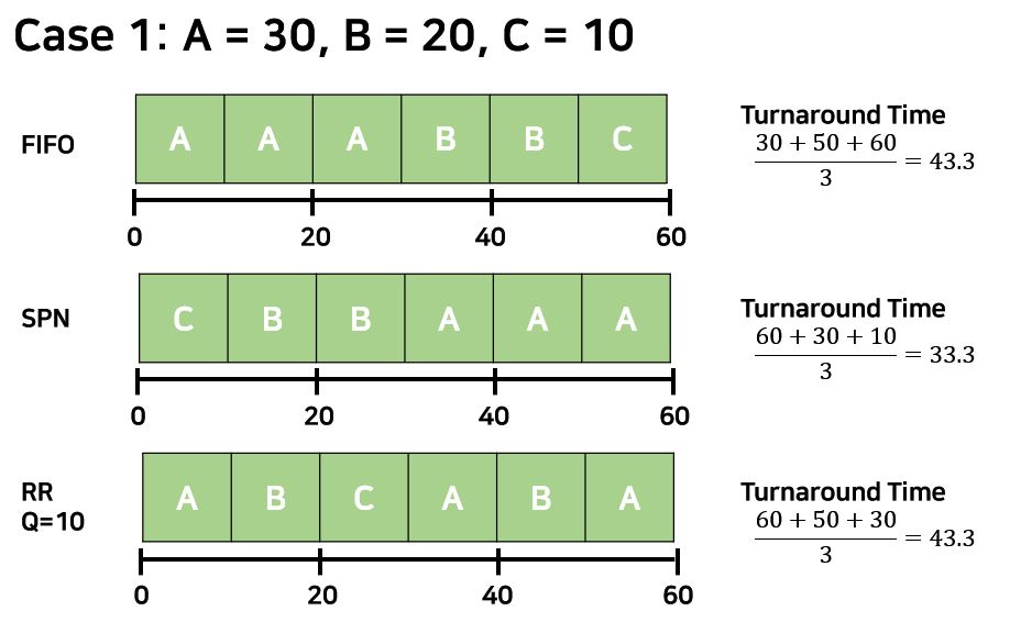 그렇다면 이제 Scheudling Algorithm들에 대한 실질적인 비교를 해보자. FIFO와 SPN, 그리고 Round Robin(RR)까지 한번에 비교를 할 것이다.