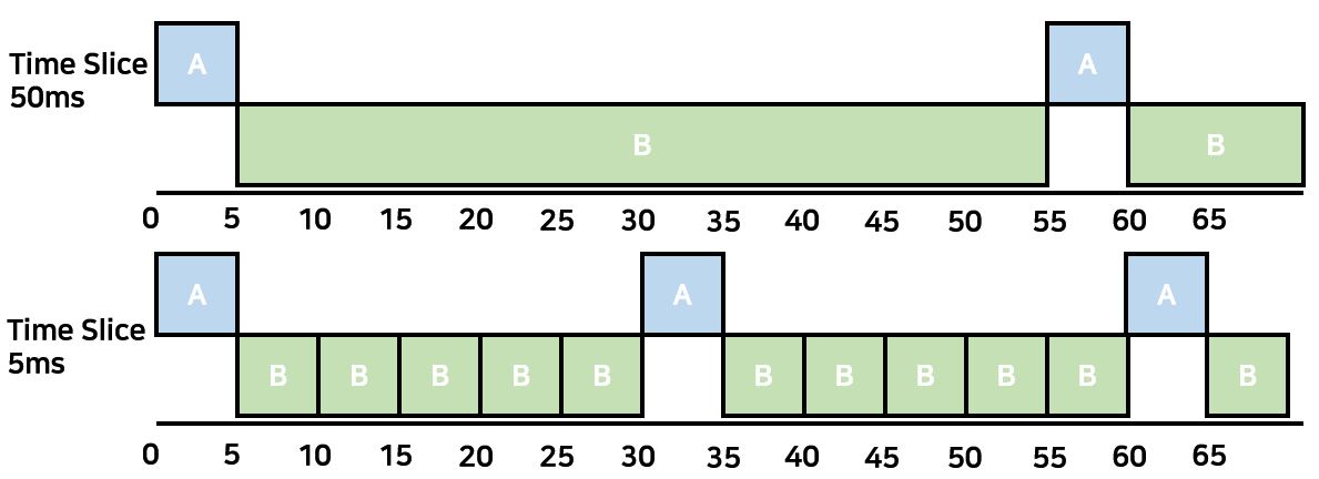 예를 들어 두 개의 Process가 있다고 가정하자. 하나의 Process는 5ms의 Service Time을 가지고 있고, I/O를 위해 25ms를 대기하고 있다. 반대로 다른 Process는 CPU-Intensive하여 Waiting이 발생하지 않는 CPU Burst적인 Operation을 한다고 하자. 아래의 그림은 각각 Time Slice가 50ms, 5ms일때의 상황이다.