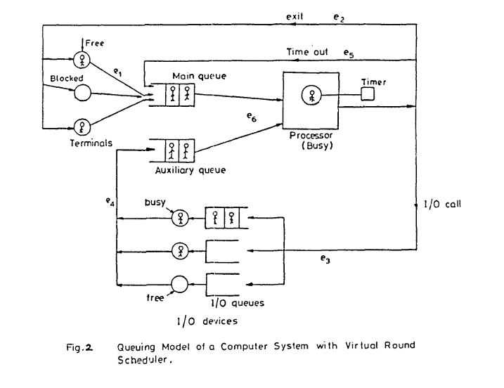 Virtual Round Robin은 Round Robin의 문제점을 잡기 위해 등장하였다. Round Robin의 문제점은 이 Quantum을 짧게 하면 결국 SPN처럼 동작하기에 CPU Bound Process들이 뒤로 밀리는 Convoy Effect가 발결될 수 있는 점이었다. 이 알고리즘은 Round Robin과 크게 다를 것이 없지만 새로운 보조 큐를 생성하게 된다. 만약 I/O Request 때문에 자신에게 주어진 Time Slice를 전부 소진하지 못하고 Block 상태로 들어간 Process들이 있을 것이다. 일반적인 RR이었다면 해당 Process들을 깨워줄 수 있는 Event가 발생하게 되면 Ready Queue의 맨 뒤로 돌아가 Front에 올때까지 기다려야 하지만, VRR에서는 새롭게 생성한 보조 큐에 넣게 된다. 따라서 이 Auxiliary Queue는 Time Slice를 다 소진하지 못한 Process들의 집합이 되는 것이다. 따라서 이 보조 큐에 어떤 Process가 들어오게 된다면 OS는 Ready Queue에 있는 Process를 고르는 것이 아니라 Auxiliary Queue에 있는 Process를 Running State로 고르게 된다. 이는 Simple 하면서도 Fairness를 어느정도 보장해주는 알고리즘이라고 할 수 있겠다. 아래의 그림처럼 도식화 할 수 있겠고,Fairness in processor scheduling in time sharing systems라는 논문에서 가져왔다. 출처는 아래에 적어놓겠다. 따라서 Time Slice를 전부 소진했는지 여부가 CPU, I/O Bound를 결정하게 된다. 일반적으로 CPU Bound Process는 Time Slice 전부 소진하여 Time Out되고, I/O Bound는 Time Slice를 전부 사용하지 못하는 경향을 보여준다.