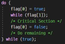이 전에는 Shared Resource인 Flag가 하나여서 문제가 생겼다면 이번에는 두 개를 만들어버리면 어떻게 될까? 그래서 Flag라는 Bool Type 배열을 만들어놓고 실행을 시켜보자. 그러나 이 방법 역시 문제가 있다. 만약 flag[0] = true;를 해버리고 Scheduler에 의해 오른쪽으로 넘어간다고 해보자. 그러면 flag[1] = true;까지는 되지만 while(flag[0])에서 걸려 무한루프가 걸려버릴 것이다. 만일 어떻게 Scheduler에 의해 다시 왼쪽으로 넘어간다고 하더라도 이번에 역시 while(flag[1])에 걸려서 여기도 무한루프를 돌 것이다. 양쪽에서 busy waiting이 되고 있는 것이다. 이는 Progress 위반이다. 어떠한 Thread들도 진행되고 있지 못하고 있는 상태이다.