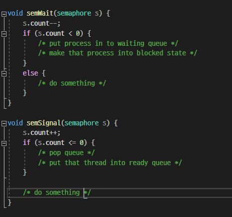 세마포어의 구현은 아래의 그림처럼 구현할 수 있다. Wait을 하는 것은 자원을 소모하는 것이기 때문에 세마포어 변수를 감소시켜준다. 만약 세마포어 변수가 음수가 된다면 현재 자원이 사용중이기 때문에 wait queue에 넣어준다. Signal은 다시 자원을 복구하는 것이기 때문에 세마포어 변수를 증가시켜준다. 만약 세마포어 변수가 0 이하라면 wait queue에 있는 Thread를 pop해서 실행시켜준다. 만약 세마포어 변수가 양수가 된다고 하더라도 상관이 없는 것이 아무것도 안해주면 된다. 물론 이렇게 구현하는 것은 정말 간단한 방법이기때문에 완벽한 Semaphore의 구현이라고는 할 수 없다. 이는 뒤에서 자세히 다뤄보겠다. 이진 세마포어는 Enum같은 자료형을 활용해서 구현할 수도 있다. 어차피 0, 1 두 가지의 상태만 가지기 때문이다.