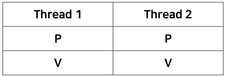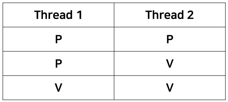 Mutex에서는 P, V Operation이 쌍으로 함께 가야하는 반면에 Semaphore에서는 굳이 쌍으로 이루어지지 않아도 된다. 만약 같은 Semaphore를 사용하고 있더라도 누군가 깨워주기만 하면 되기 때문에 Unstructed Construct 형태로 구현이 가능하다. 이 부분에 대해서는 Conditional Sync에서 자세히 다루어 보겠다.