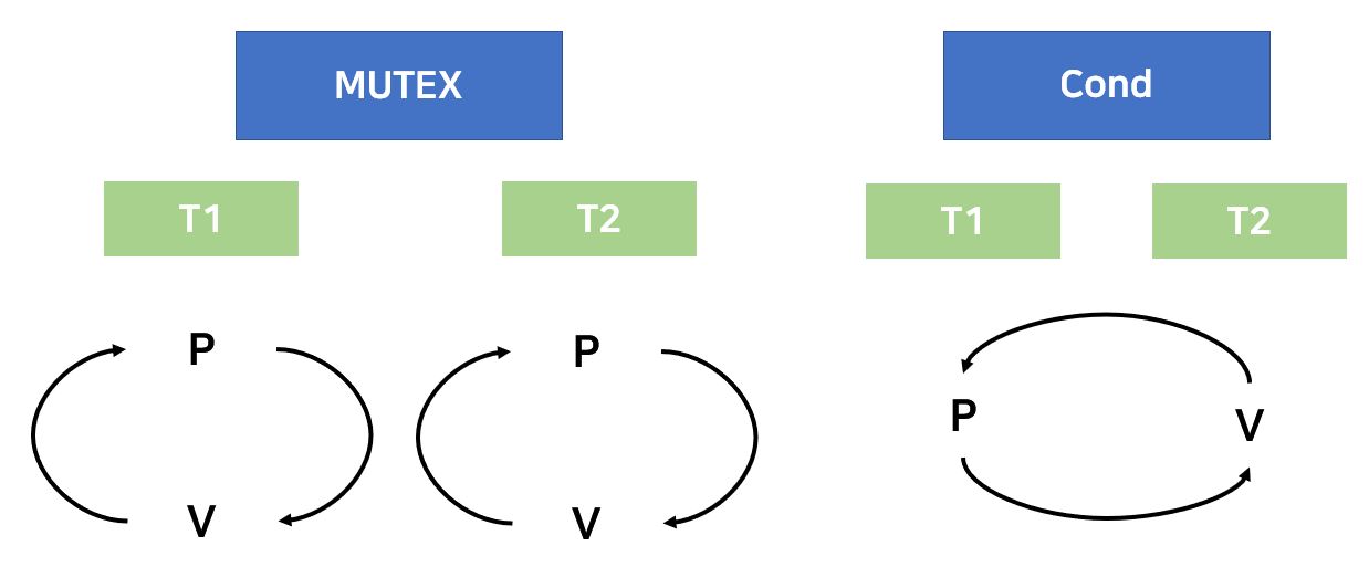 일반적으로 thread가 Condition을 충족할 때까지 기다려야하는데, 가장 쉬운 구현 방법으로는 while문이 떠오를 것이다. 그러나 앞서서 다뤄보았지만 while문 같은 Spin Lock 작동 방식은 그다지 효율적이지는 않다. 따라서 정확한 Event에 의해 깨어나는 것이 더욱 효율적이라고 할 수 있겠다. 앞에서 예시로 들었던 semaphore나 pthread를 활용한 코드에서는 pthread_join이라는 API가 있었다. 이것은 인자로 받은 쓰레드가 종료될 때까지 기다리는 것이다. 이 API에는 "종료가 될 때"라는 조건이 달려있다. 이 조건을 만족시켜도록 깨워주는 API는 각각의 increment, decrement Function의 마지막에 있는 pthread_exit 이다. 이것이 V Operation, 즉 Signal처럼 동작을 하게 하는 것이다. 이런게 바로 조건 동기화이다. while문을 통해 기다리는 busy-waiting 방법은 직관적이지만 너무나 비효율적이기 때문에 우리는 Conditional Variable(이하 CV)을 사용해서 조건을 만족시키도록 할 것이다.