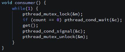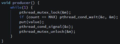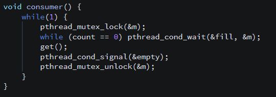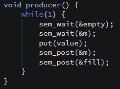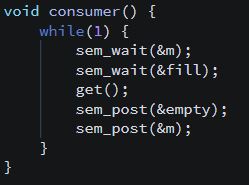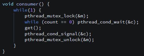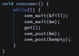 우리가 pthread 군을 배웠으므로 이렇게 구현할 수도 있다고 생각할 수 있다. 그러나 Semaphore는 pthread와는 다르게 General한 version이다. 위에서 사용한 pthread_cond_wait은 mutex를 일시적으로 해제하는 release code가 있었다. 따라서 임계영역에 있는 자원을 사용할 수 있었다. 그러나 Semaphore는 이러한 기능이 없다. 먼저 위의 코드처럼 먼저 mutex를 걸어버리고 만약 다른 process가 interleave한다면 아무도 자원을 사용하지 못하는 deadlock에 걸려버릴 수 있다. 따라서 위와 같이 구현하는 것이 아니라, 자원을 컨트롤 하는 바로 앞, 뒤에 mutex를 걸어주어야 한다. 따라서 아래와 같이 구현하면 간단하게 생산자 소비자 문제를 해결할 수 있다.