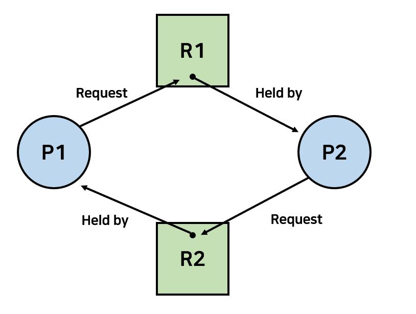 4. Circular Wait(순환대기): 순환적으로 P0 -> P1 -> P2 -> ... -> Pn -> P0로 순환적으로 대기하는 상황이 발생한다.